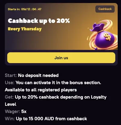 Every Thursday, Aussies have the chance to claim up to 20% in Zoome casino cashback depending on your loyalty level. This is a no-deposit freebie that has a 5x wagering requirement and a max win of up to A$15,000. To qualify for this bonus, your minimum spent sum must be A$1.5 over the last 7 days, and the maximum amount of cashback a player can receive is A$7,500.