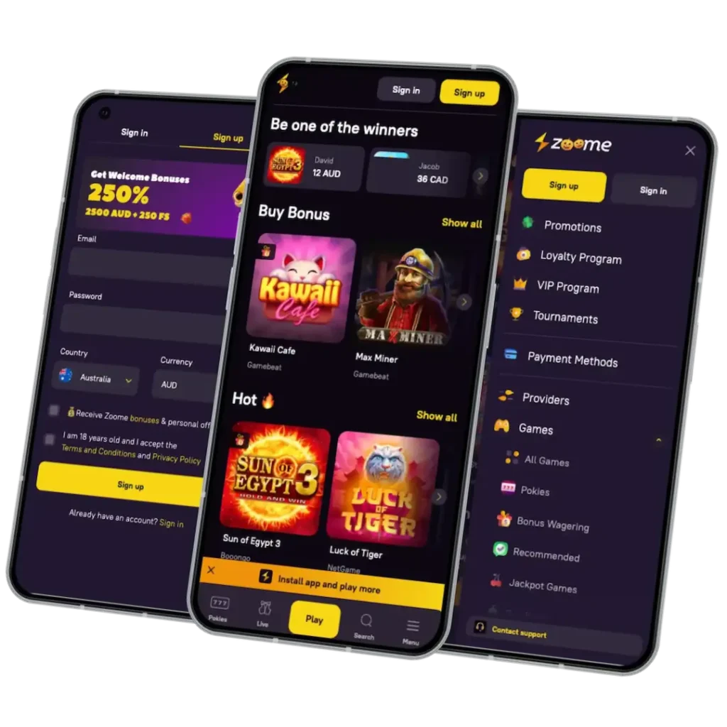 Deciding to play on mobile using the Zoome Casino app comes with many benefits for players from Australia. In addition to the convenience it offers, you will also witness top-notch graphics, presentation and security features that’s similar to our desktop site. All our 9,500 games that include pokies, table games, specialised options and live dealer titles are available for real money gaming on mobile. Furthermore, Aussies will be able to make payments, claim bonuses beginning with our welcome pack of up to A$2,500+250 free spins, weekly reload perks, loyalty and VIP program, tournaments and lots more.