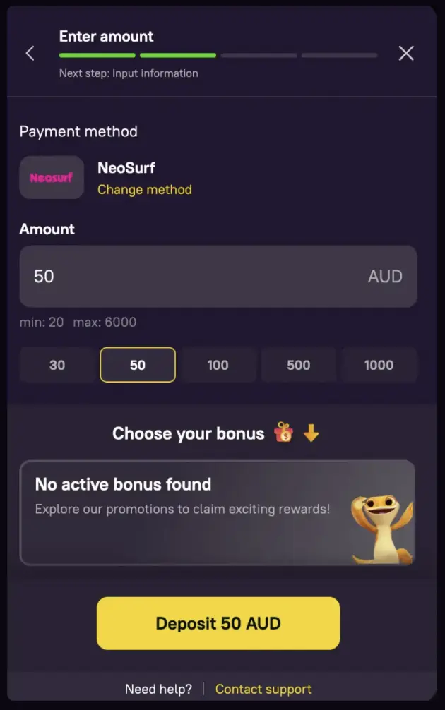 To top up your account for the first time, you need to be signed in. Thereafter, click the “Deposit” tab to get redirected to our cashier section and follow these steps to make your first deposit.