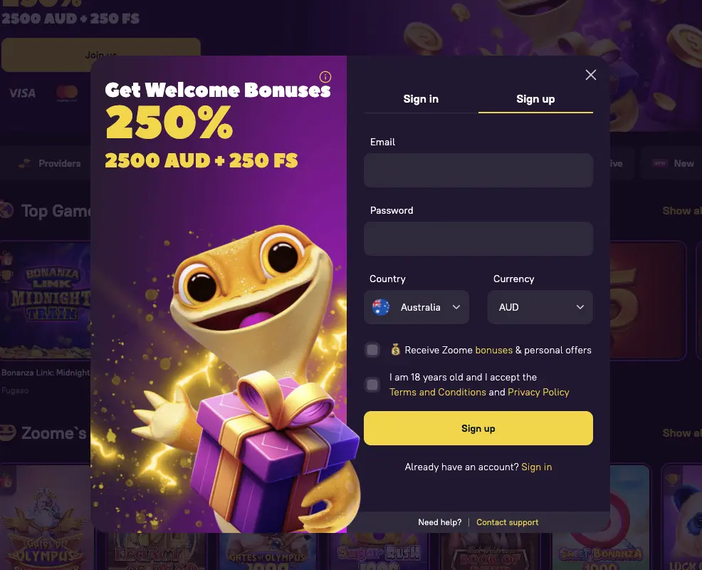 To gain access to all our real money gambling offers, you’re required to finish your Zoome Casino sign up process. Only those who are not interested in playing for real can access our games in demo mode. Nonetheless, when you complete your registration, you’ll be able to play any of our 9,500+ titles that include online pokies, RNG table games, speciality options, as well as live dealer tables for the chance to win real money. Furthermore, newly registered Aussies can claim a welcome pack of up to A$2,500 + 250 free spins. Other promotions include a loyalty and VIP program, numerous tournaments, Wheel of Fortune, cashback, weekly reload perks and more.